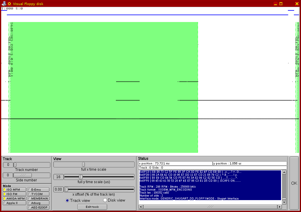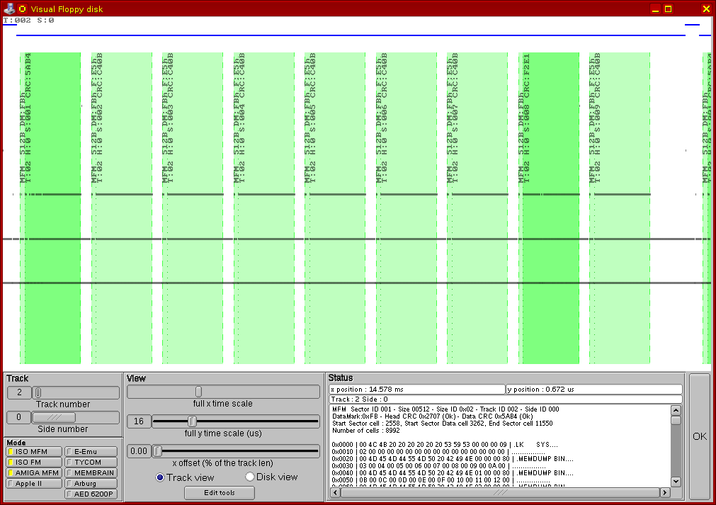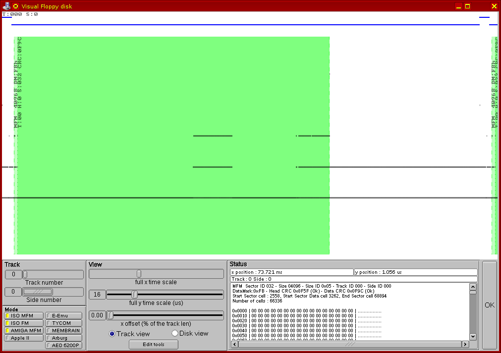 Se poate vedea clar că pe fața 0 a pistei 0 există un singur sector, de 4096 octeți, iar prin punerea cursorului de mouse deasupra zonei verzi (zona sectorului propriu-zis), apare în dreapta jos întreg conținutul sectorului, listat în mod text (hexa) cu tot cu informațiile de formatare aferente. Am selectat cu mouse-ul întregul text, după cum se vede în următoarea imagine, și l-am extras într-un fișier separat, și am repetat operația pentru ambele fețe ale ambelor piste sistem (0 și 1). Am obținut astfel listingul prezentat mai înainte al conținutului pistelor sistem.