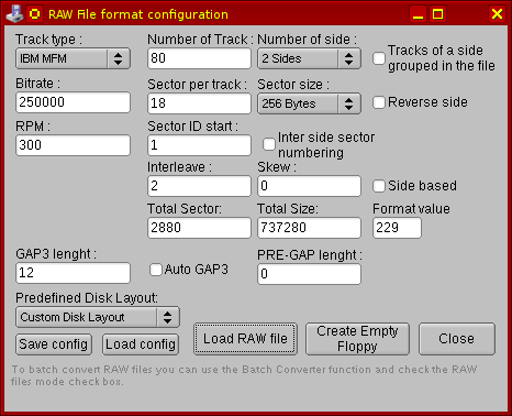 | 3. Va apare o altă fereastră ("RAW File format configuration") în care trebuie introduşi parametrii de formatare ai dischetei corespunzătoare imaginii RAW care trebuie convertită (vezi imaginea următoare din dreapta). În această fereastră toţi parametrii necesari vor apare cu nişte valori implicite. Unele din ele vor trebui schimbate pentru a corespunde cu formatul CP/M CoBra, după cum urmează: | |
