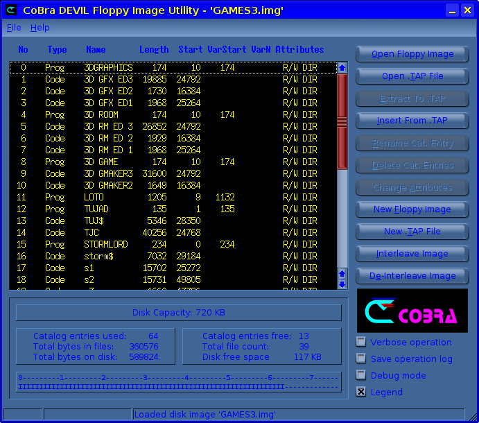 Utilitar Linux scris în C Standard pentru transfer fişiere din imagini RAW floppy DEVIL Cobra (cobra-devil-diskimg-copy.c) |