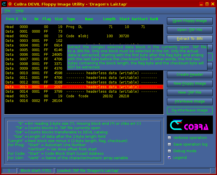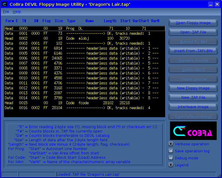 Din cauza stilului Spectrum de stocare a informațiilor pe bandă magnetică, transferul de fișiere din/în imagini floppy CoBra DEVIL (cu utilitarul de față) se face în format .TAP, conform descrierii acestui format de către Gerton Lunter, autorul emulatorului Spectrum „Z80”. La extragerea unei aplicații dintr-o imagine floppy DEVIL trebuie specificat un domeniu de blocuri, folosind indexul blocurilor de date din catalogul de disc afișat cu comanda -l (listare). Deci mai întîi se afișează conținutul imaginii floppy cu comanda -l, după care se poate da comanda -x cu domeniul de blocuri care trebuie extrase. De regulă primul bloc va fi un „Program”, urmat de cîteva alte blocuri de „Code”. Dacă primul bloc este afișat de exemplu cu indexul 1 iar blocurile următoare care fac parte din aceeași aplicație au indexurile 2, 3, 4, 5, 6, domeniul care trebuie folosit pentru extragerea aplicației din imaginea DEVIL este „1-6”. Fișierul .TAP astfel extras va purta numele primului bloc din domeniul specificat, care de regulă va fi numele original al programului respectiv.