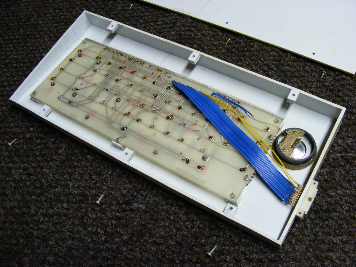 Atunci cînd am asamblat eu CoBra pentru prima oară, prin '91-'92, am decis să fac o carcasă separată pentru tastatură. În ea am pus tastatura propriu-zisă şi difuzorul (o cască telefonică). Legătura cu calculatorul era făcută printr-un cablu panglică cu 20 de fire, între o mufă aflată pe carcasa tastaturii şi o mufă aflată pe carcasa calculatorului. Tastatura arăta cam aşa: