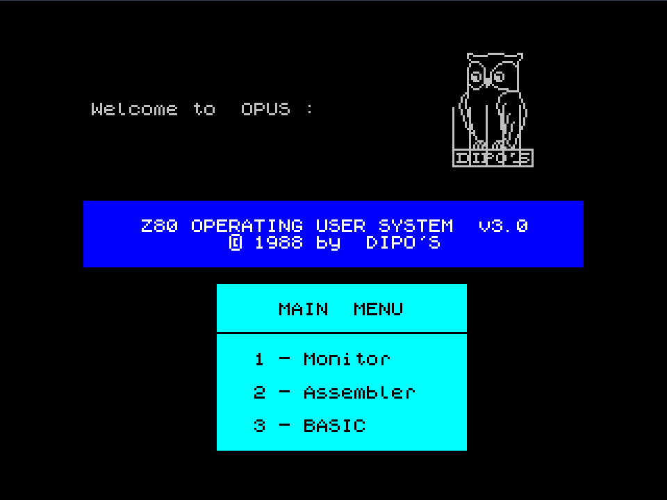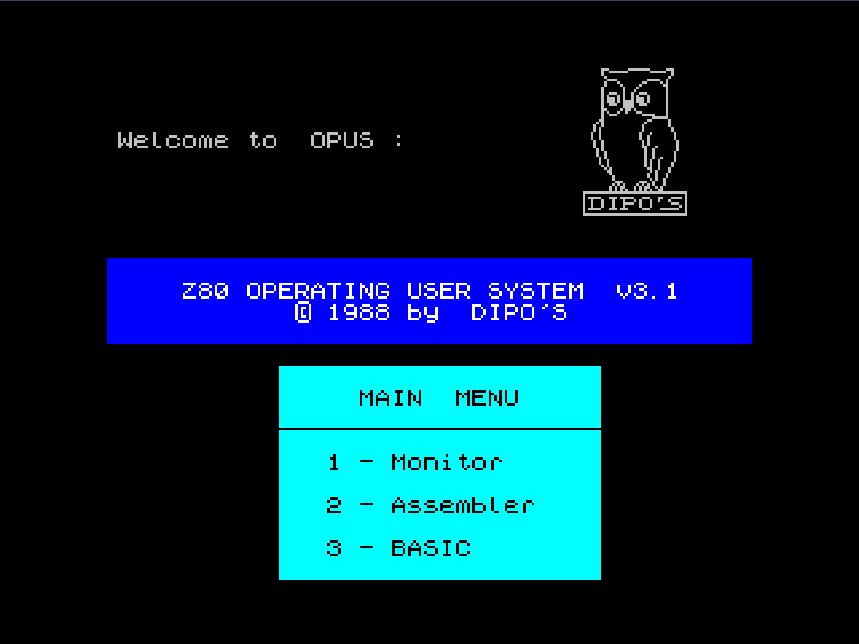 1: | Right after startup, the program displays a start menu with 3 options: monitor, assembler and return to BOOT ROM. The character set used seems identical to the one used by the ROM-stored OPUS version |